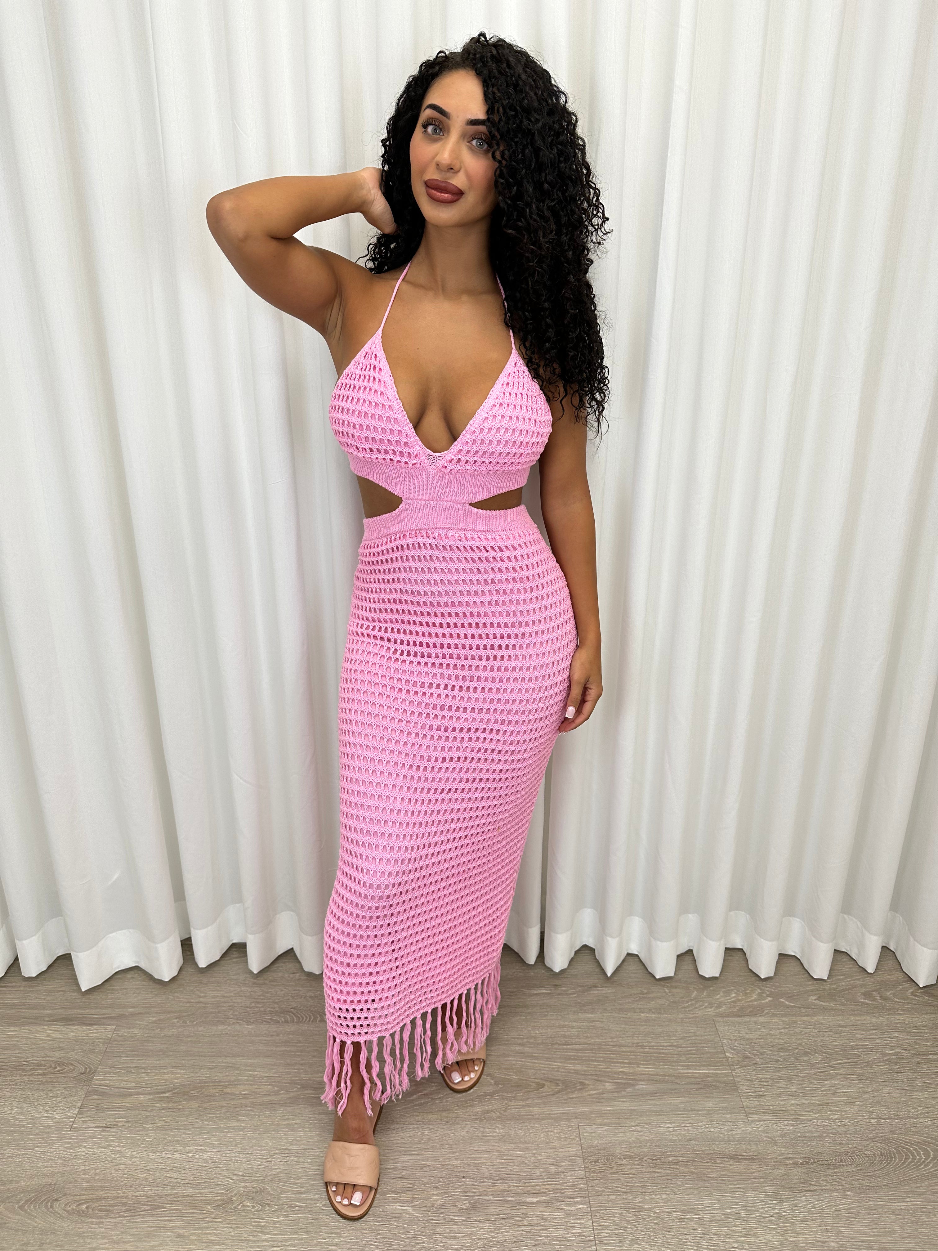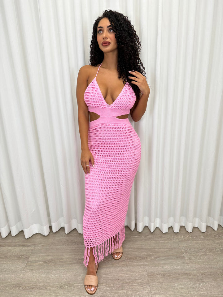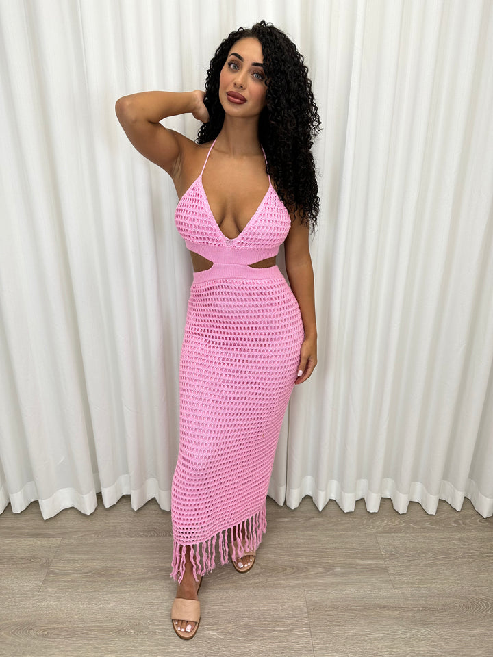 This dress boasts a stretch textured knit crochet fabric that combines style and comfort.