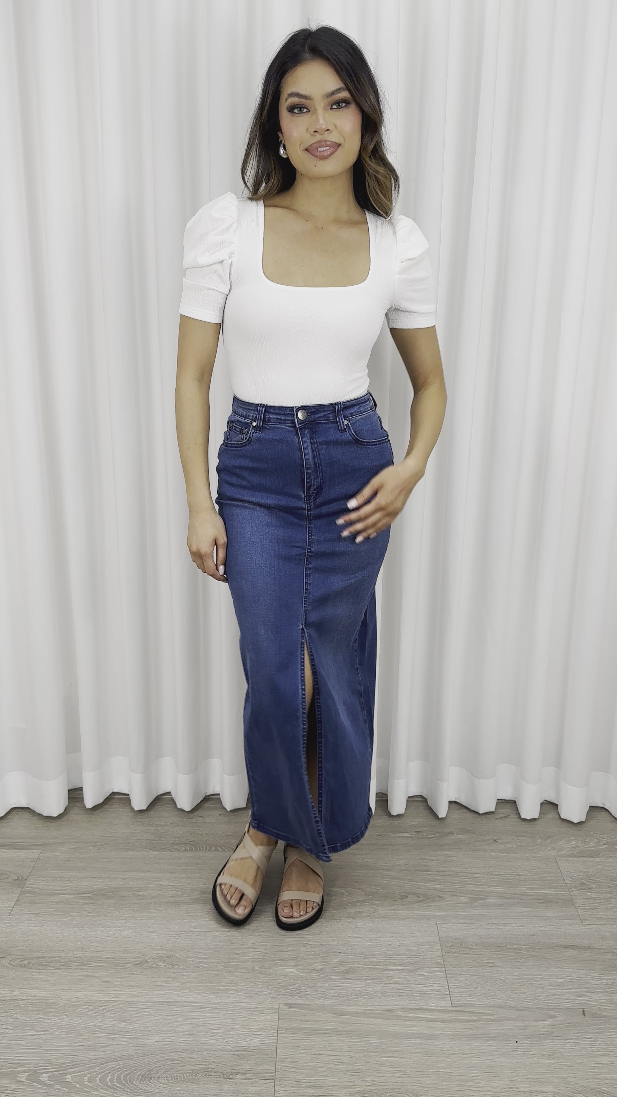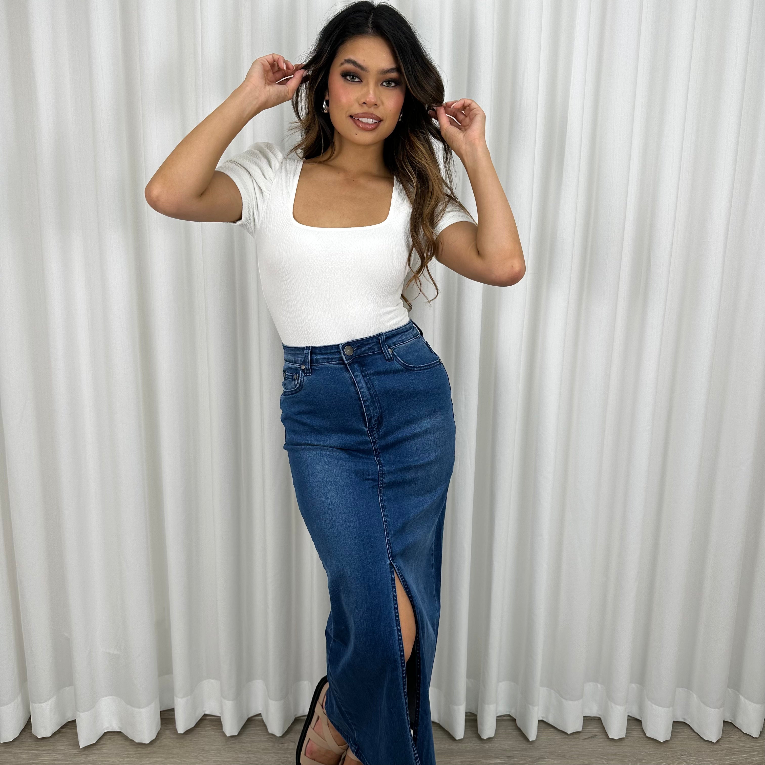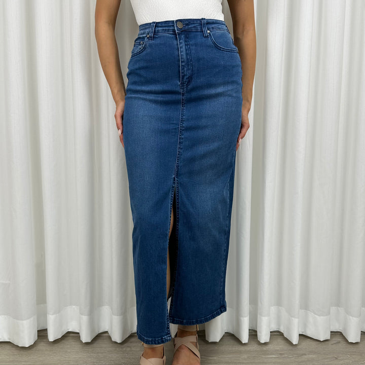 Stretch denim fabric, this denim skirt promises all-day comfort and flexibility, allowing you to move with ease an...