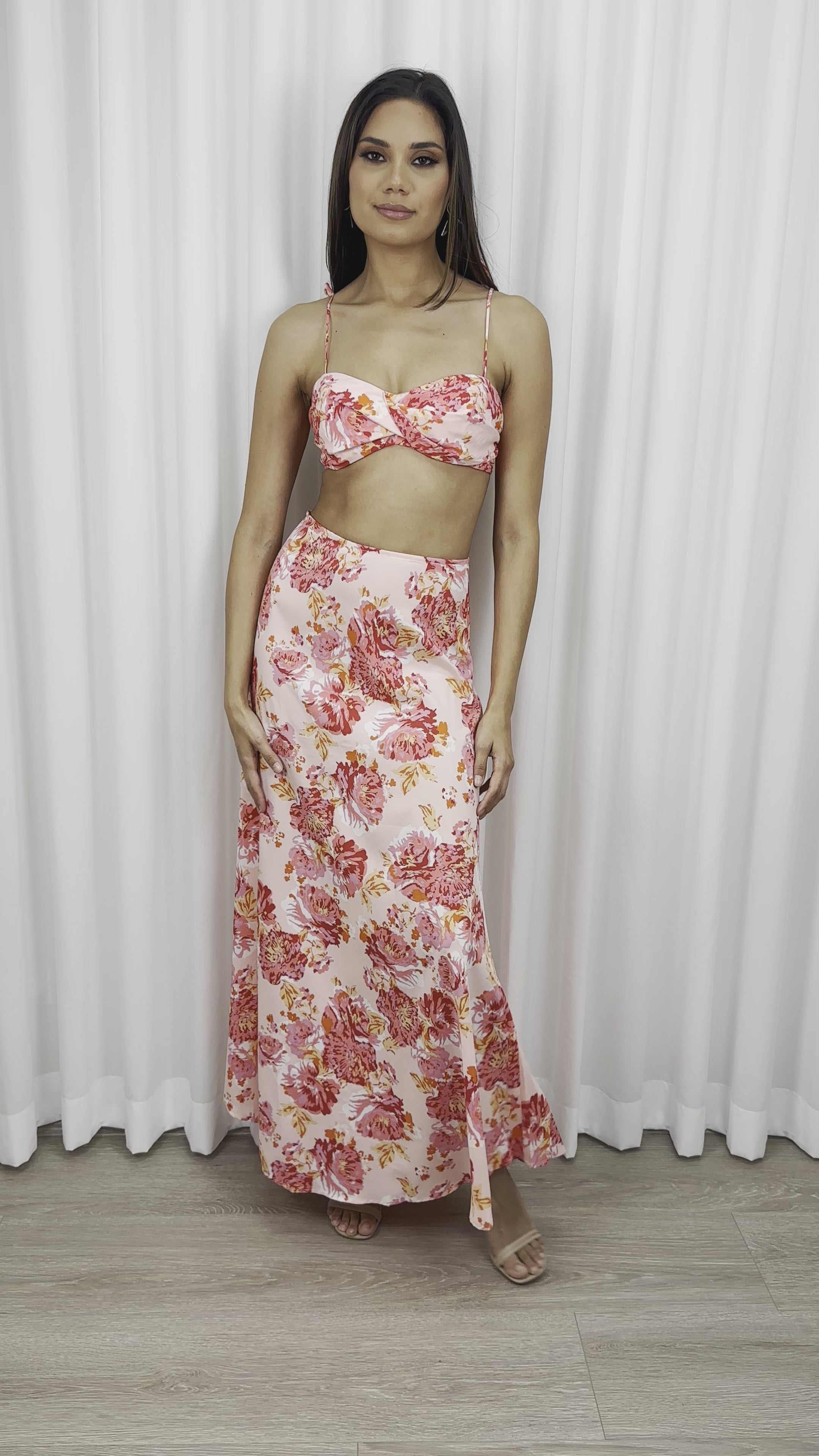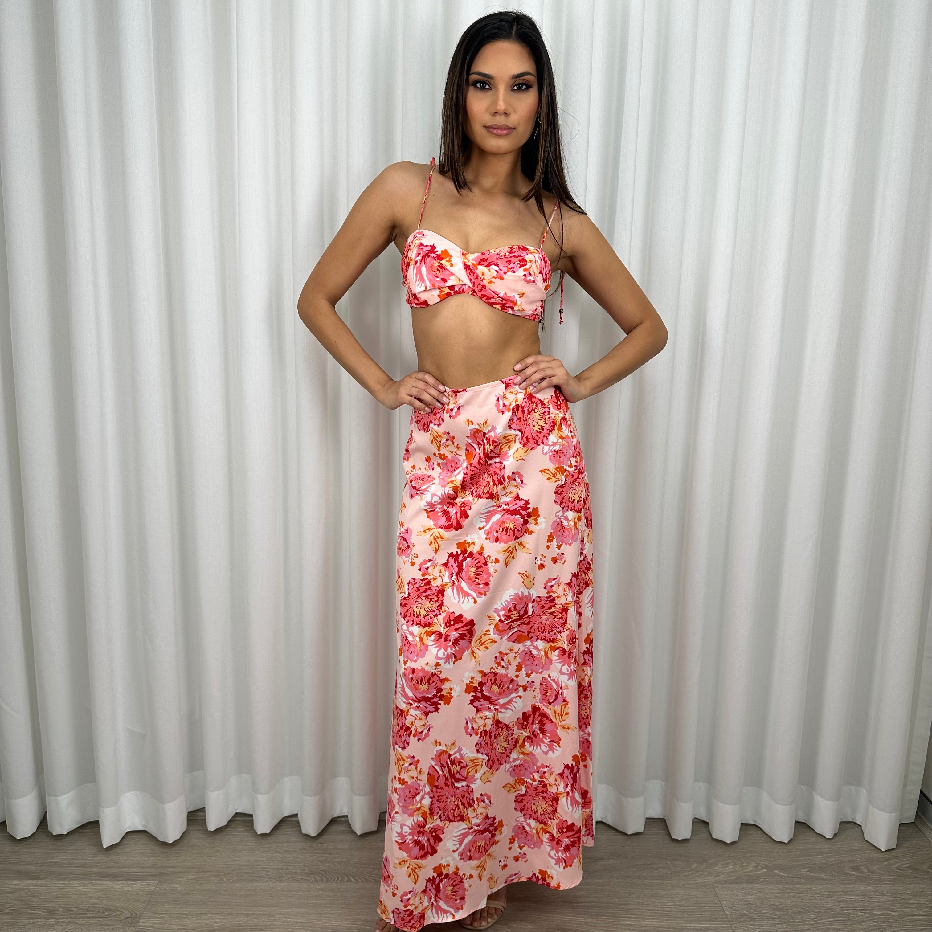 The floral crop top features a charming tie-back